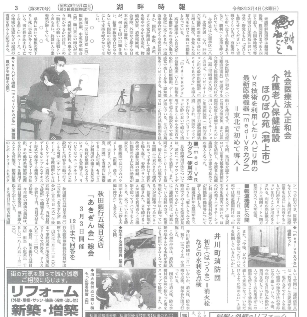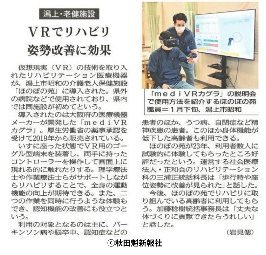 介護老人保健施設では東北で初めて導入されたVRを使用したリハビリ機器、mediVRカグラについて秋田朝日放送トレタテ!で放送されたほか、秋田魁新報、湖畔時報で掲載されました。