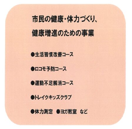 本拠点施設は、県と協働のプログラムに取り組むことにより、若い世代から高齢者の方まで幅広い年代の方々の健康づくりに取り組むことができるように各種健康・運動教室や有酸素運動、筋力トレーニングができる機器を取りそろえ、多くの方々の健康づくりの拠点となることを目指しています。
